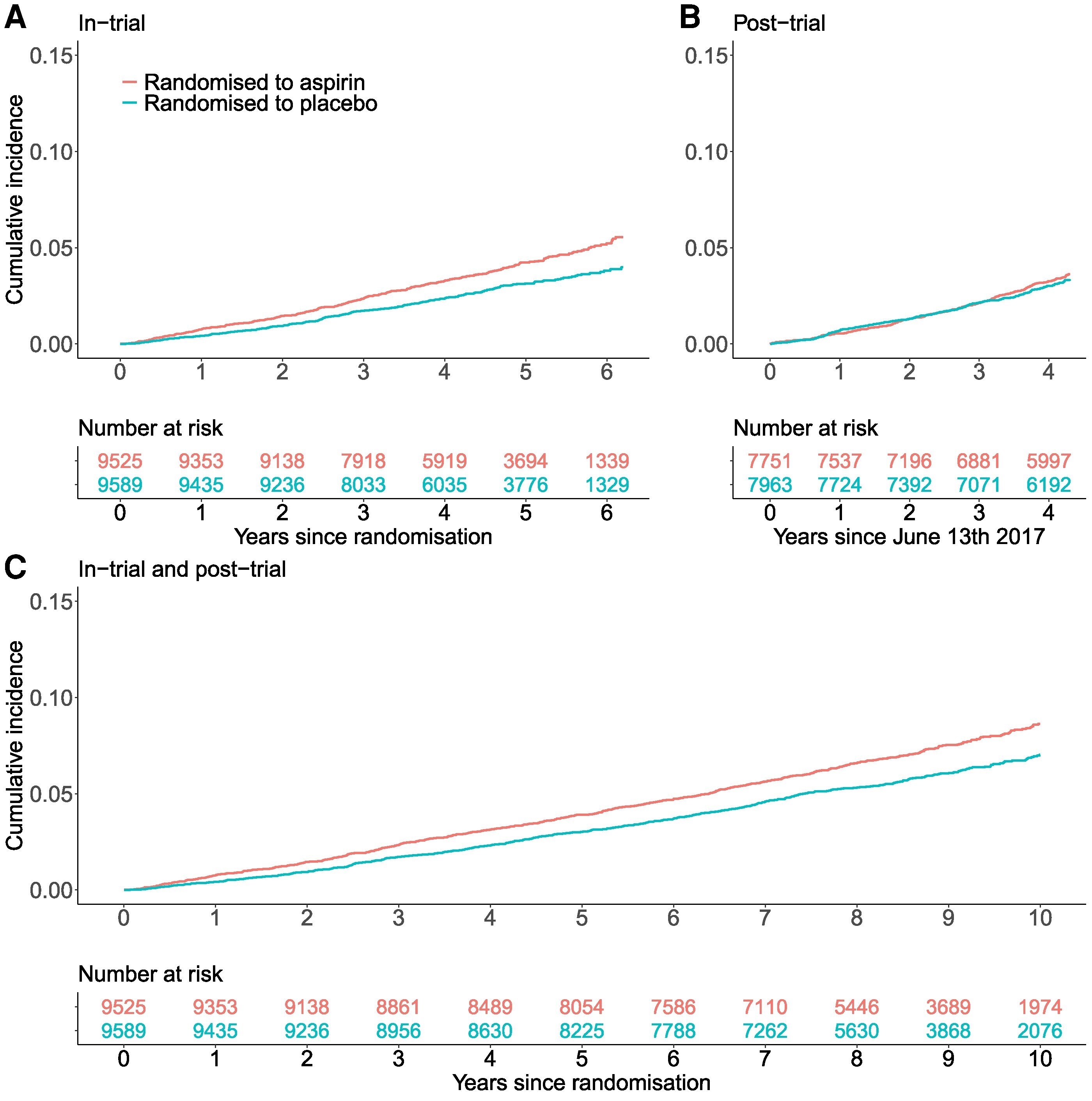 Cependant, pendant la période post-essai (médiane de 4,3 ans), le taux de MACE était plus élevé (RR 1,17, IC à 95 % : 1,01-1,36) chez les participants randomisés dans le groupe aspirine comparativement au groupe placebo. Sur l’ensemble de la période, le taux d’hémorragies majeures était plus élevé dans le groupe aspirine randomisé comparativement au groupe placebo (RR 1,24, IC à 95 % : 1,10-1,39).