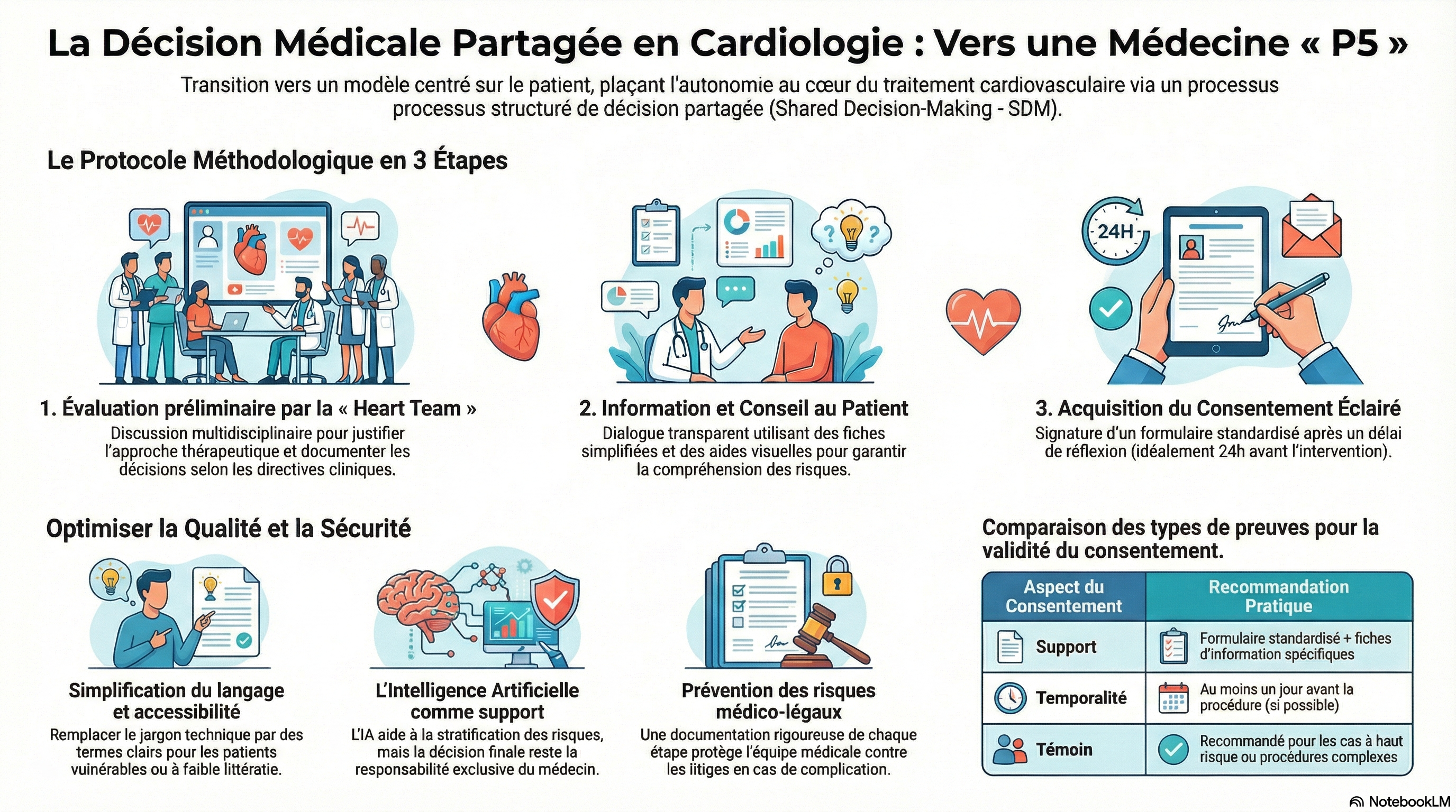Cet article scientifique explore l'évolution du consentement éclairé vers un modèle de prise de décision partagée au sein de la cardiologie moderne. Les auteurs proposent une méthode structurée en trois étapes, impliquant une évaluation multidisciplinaire par la « Heart Team », un dialogue pédagogique approfondi et une signature protocolaire du consentement. Le texte identifie des lacunes majeures dans les pratiques actuelles, notamment la complexité du langage médical et le manque de prise en compte des populations vulnérables. Pour y remédier, l'usage de l'intelligence artificielle et d'outils visuels est suggéré afin d'améliorer la compréhension des patients. Enfin, l'étude souligne les implications médico-légales cruciales liées à la validité du consentement pour protéger tant l'autonomie du malade que la responsabilité du médecin.