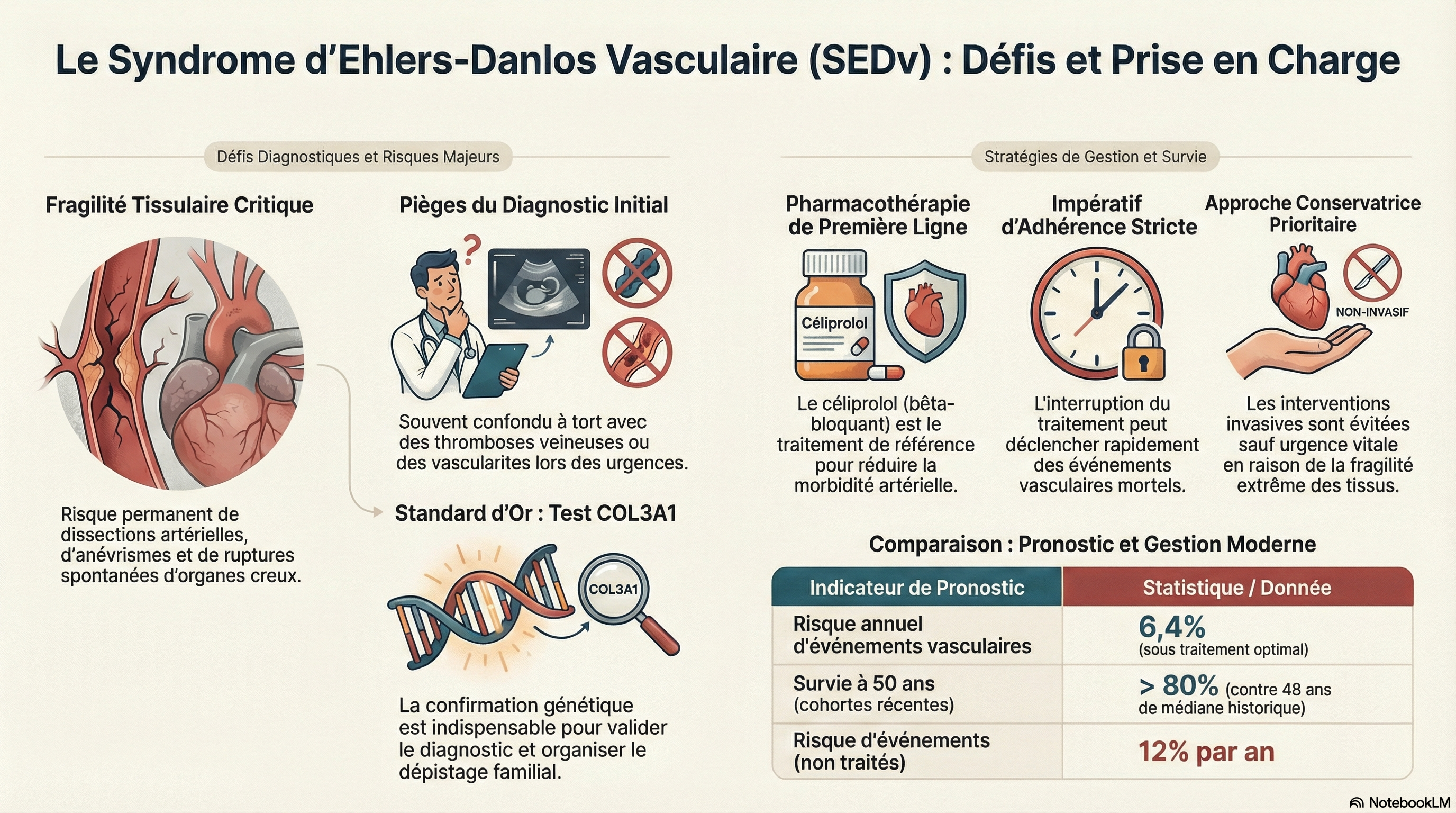 Cette étude clinique explore les complexités médicales et les défis de prise en charge liés au syndrome d’Ehlers-Danlos vasculaire (vEDS), une maladie génétique rare entraînant une fragilité artérielle extrême. À travers l'analyse de trois cas concrets, les auteurs soulignent l'importance vitale d'une adhérence stricte au traitement pharmacologique, notamment au céliprolol, pour prévenir des complications mortelles. Le texte met en lumière la nécessité d'un suivi multidisciplinaire dans des centres experts afin d'éviter les erreurs de diagnostic et de privilégier des stratégies conservatrices face aux risques élevés des interventions chirurgicales. En fin de compte, cet article sert de plaidoyer pour une surveillance continue et coordonnée tout en reconnaissant le besoin urgent de nouvelles options thérapeutiques pour améliorer le pronostic vital de ces patients.