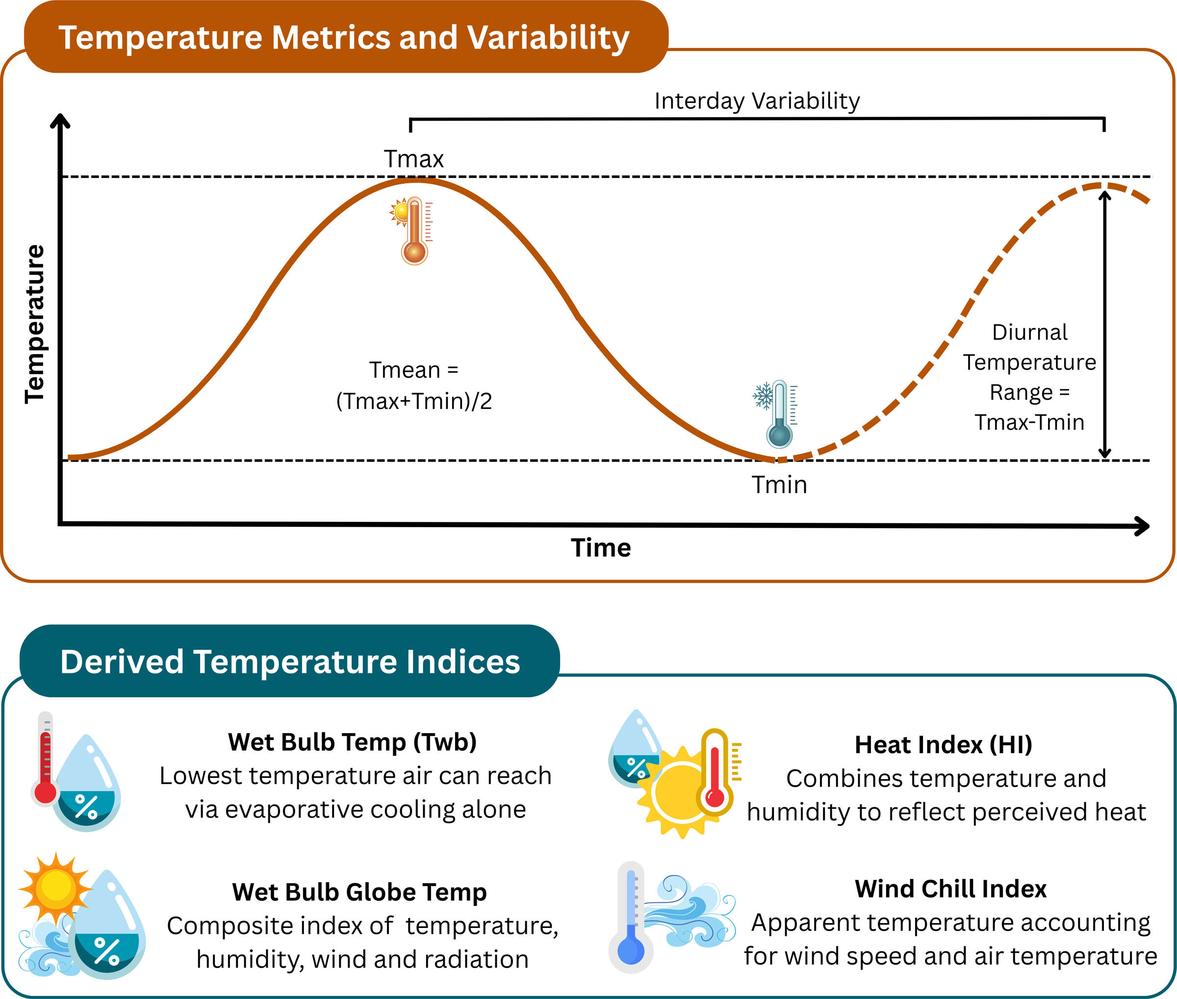 Métriques de température ambiante fréquemment utilisées, variabilité et indices dérivés.