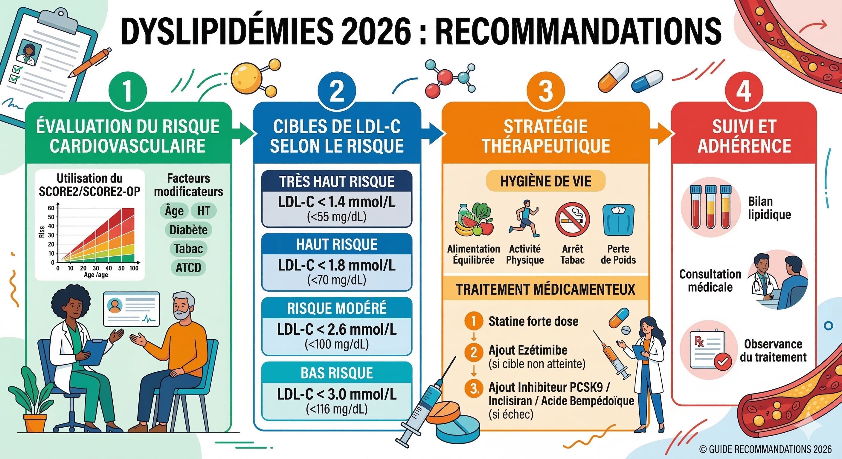 - Retour des cibles thérapeutiques : Les objectifs de niveaux absolus de LDL-C et de cholestérol non-HDL sont réintroduits pour guider le traitement, parallèlement au pourcentage de réduction du LDL-C.