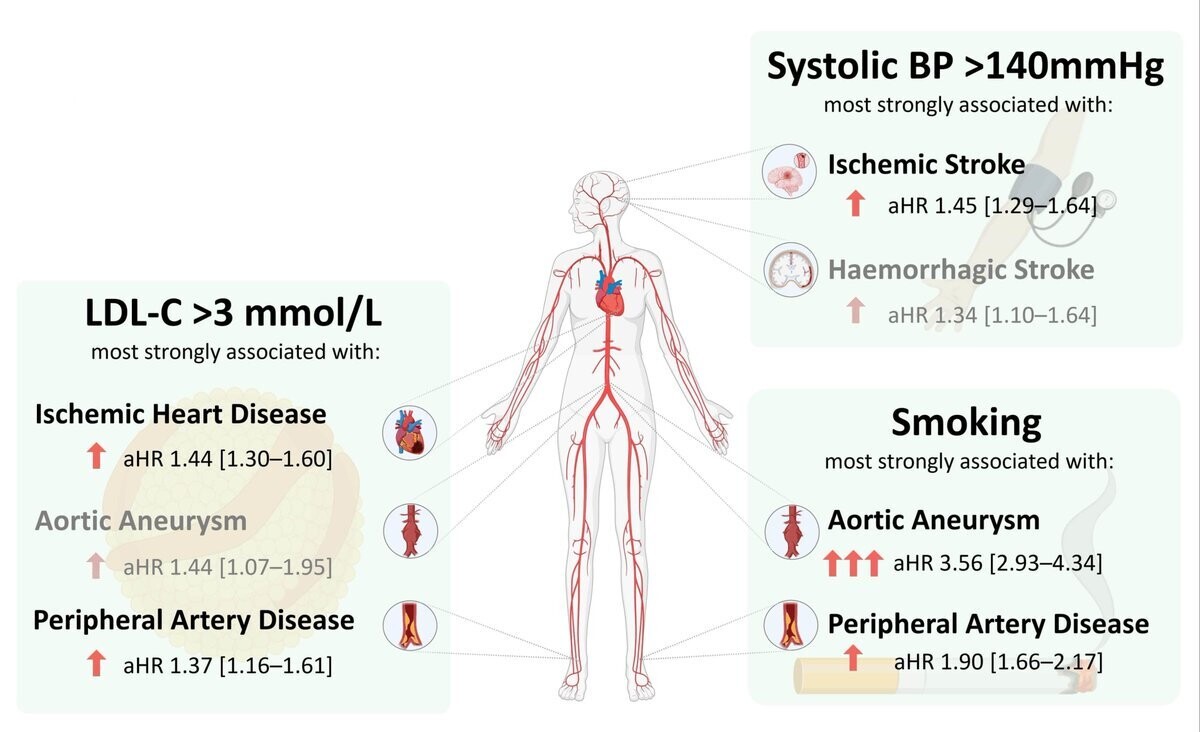 Facteurs de risque et premiers événements de maladie cardiovasculaire : Bien que la contribution de ces facteurs de risque aux différents types de maladies cardiovasculaires se recoupe, l’ampleur de leurs effets diffère. Pour tous les événements cardiovasculaires confondus, le tabagisme était le facteur de risque le plus important. Le tabagisme était particulièrement fortement lié à l’anévrisme de l’aorte abdominale, avec un impact plus important que l’hypercholestérolémie et l’hypertension artérielle combinées. L’hypertension artérielle était le facteur de risque le plus important pour les accidents vasculaires cérébraux ischémiques et hémorragiques. Le risque de cardiopathie ischémique augmentait progressivement avec chaque facteur supplémentaire.