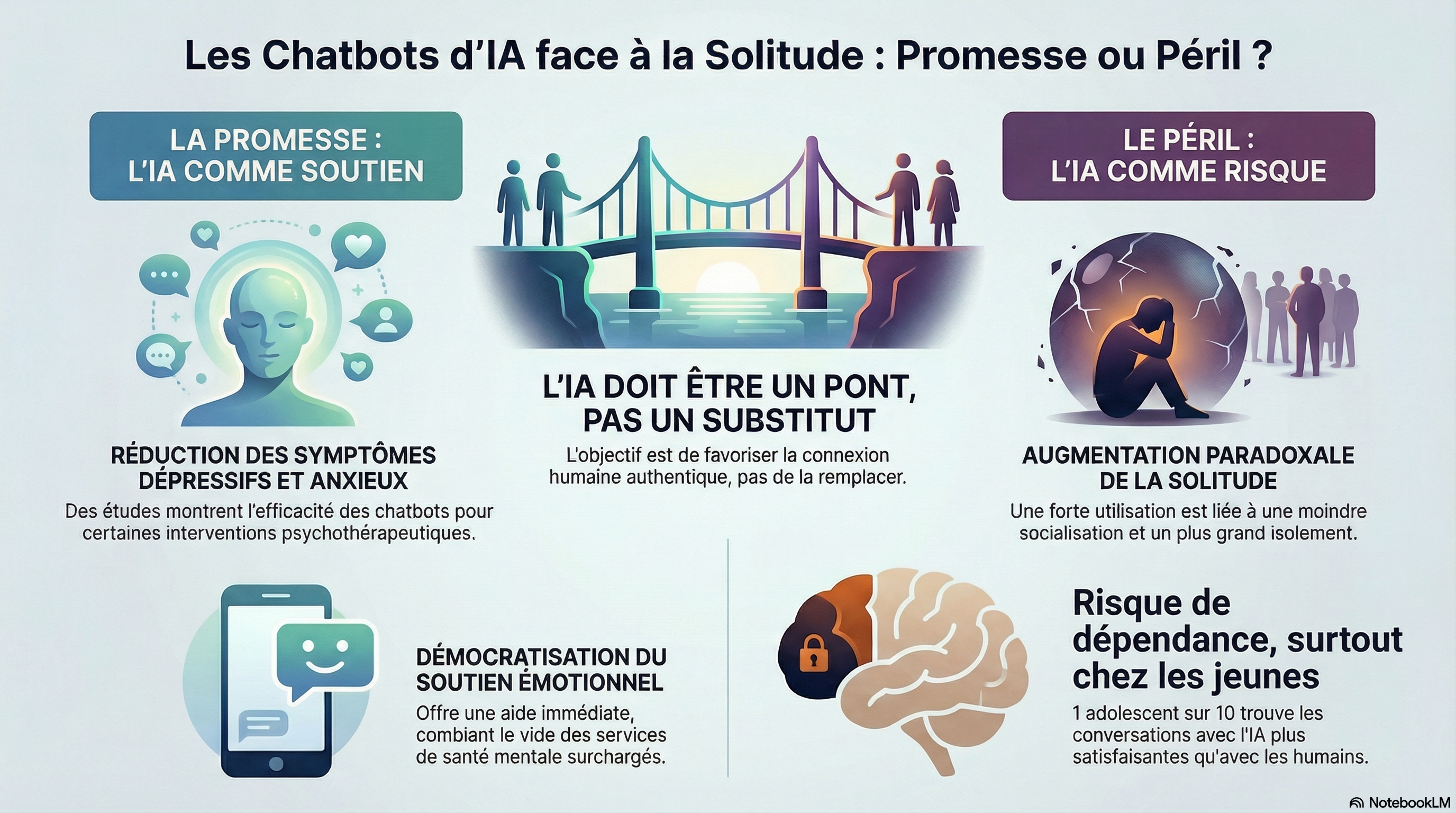 Ce texte examine le rôle ambivalent des agents conversationnels d’intelligence artificielle face à l'épidémie mondiale de solitude, qui touche particulièrement les jeunes adultes. Si ces outils offrent un soutien émotionnel accessible et immédiat, leur usage intensif risque de favoriser un isolement social accru et une dépendance psychologique envers des entités dépourvues de véritable empathie. Les auteurs soulignent que la fluidité du langage des IA incite les utilisateurs à établir des liens anthropomorphiques, remplaçant parfois les interactions humaines authentiques. Face à ces dangers, le milieu médical est encouragé à évaluer l'attachement aux chatbots comme un nouveau facteur de risque pour la santé mentale. Finalement, la source préconise d'utiliser la technologie comme un levier pour restaurer la connexion humaine plutôt que de s'en servir comme un substitut permanent.