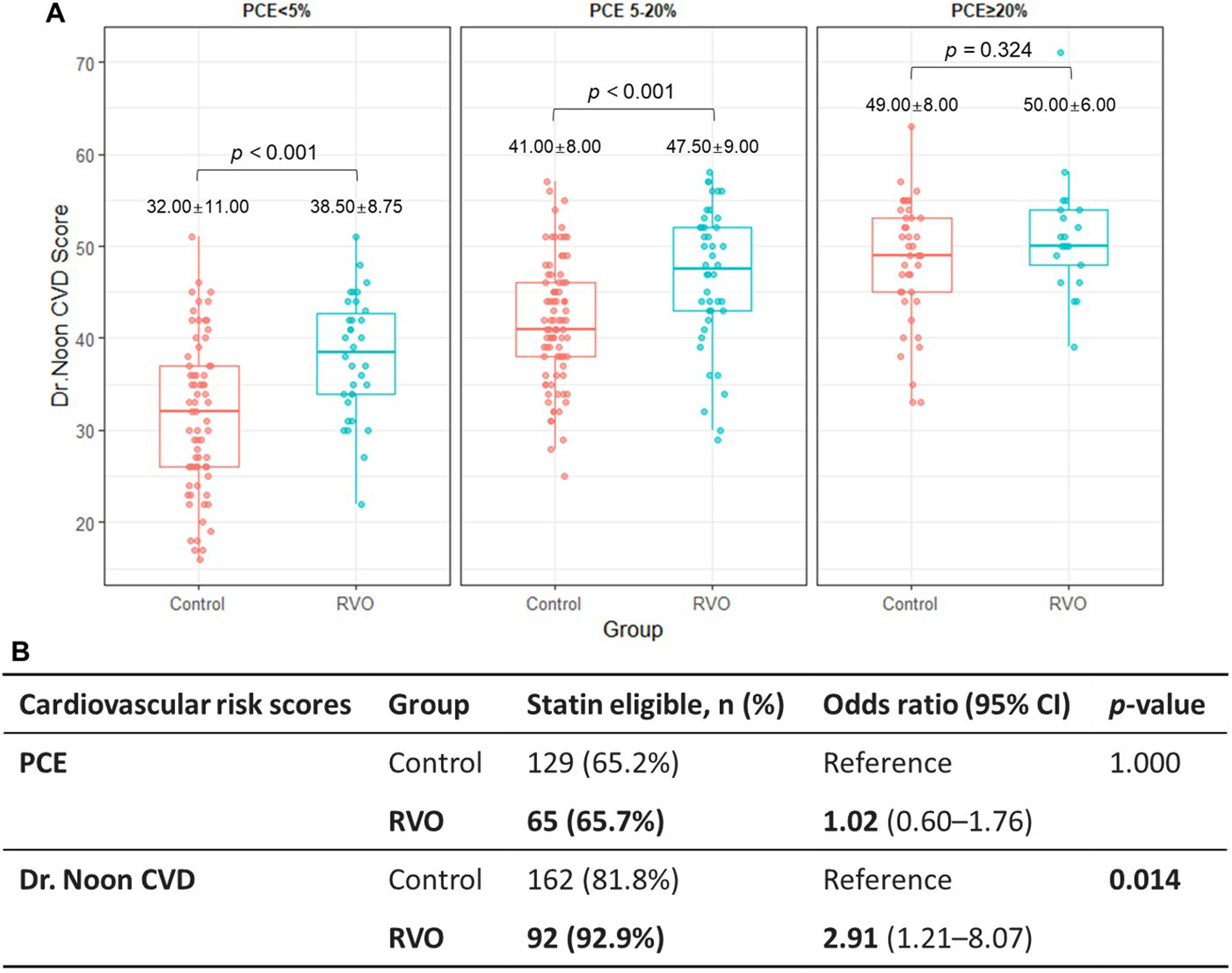 Comparaison du score CVD du Dr Noon entre les groupes RVO et témoins selon les catégories de risque PCE. Les diagrammes en boîte présentent les scores CVD du Dr Noon stratifiés par catégories de risque PCE (< 5 %, 5–20 %, ≥ 20 %). La médiane ± l’intervalle interquartile sont indiqués au-dessus de chaque groupe. Les valeurs p ont été calculées à l’aide du test de Wilcoxon pour comparer les groupes RVO et témoins au sein de chaque catégorie de risque PCE. La différence entre les groupes RVO et témoins était particulièrement marquée pour les risques PCE faibles à intermédiaires (< 20 %), suggérant que les patients atteints de RVO présentaient des scores CVD du Dr Noon systématiquement plus élevés, même lorsque le risque basé sur le PCE traditionnel n’était pas élevé. PCE = Risque cardiovasculaire athérosclérotique à 10 ans selon l’équation de cohorte combinée ; RVO = occlusion de la veine rétinienne.