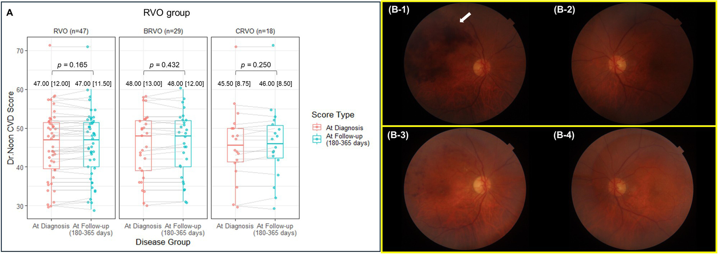 Comparaison des scores CVD du Dr Noon au moment du diagnostic et du suivi dans les groupes d'OVCR (OVCR globale, OVBR et OVCR centrale) et exemple de variation du score CVD du Dr Noon dans les groupes d'OVCR. (A) Diagrammes en boîte des scores CVD du Dr Noon au moment du diagnostic et du suivi (180 à 365 jours plus tard) par sous-type d'OVCR : OVCR globale, OVBR et OVCR centrale. Des comparaisons appariées ont été réalisées à l'aide du test de Wilcoxon. (B) Photographies du fond d'œil d'un participant atteint d'OVBR. Les panneaux B-1 et B-2 montrent respectivement l'œil étudié et l'œil controlatéral au moment du diagnostic ; les panneaux B-3 et B-4 montrent les mêmes yeux lors du suivi. Une hémorragie rétinienne en phase aiguë est observée dans l'œil étudié (B-1, flèche blanche), qui se résorbe en phase chronique (B-3). Malgré des modifications marquées de l'aspect rétinien, le score CVD du Dr Noon est resté inchangé : 58 et 57 au moment du diagnostic, et 58 et 57 lors du suivi, respectivement pour l'œil étudié et l'œil controlatéral. BRVO = occlusion de branche veineuse rétinienne ; CRVO = occlusion de la veine centrale de la rétine ; RVO = occlusion de la veine rétinienne.
