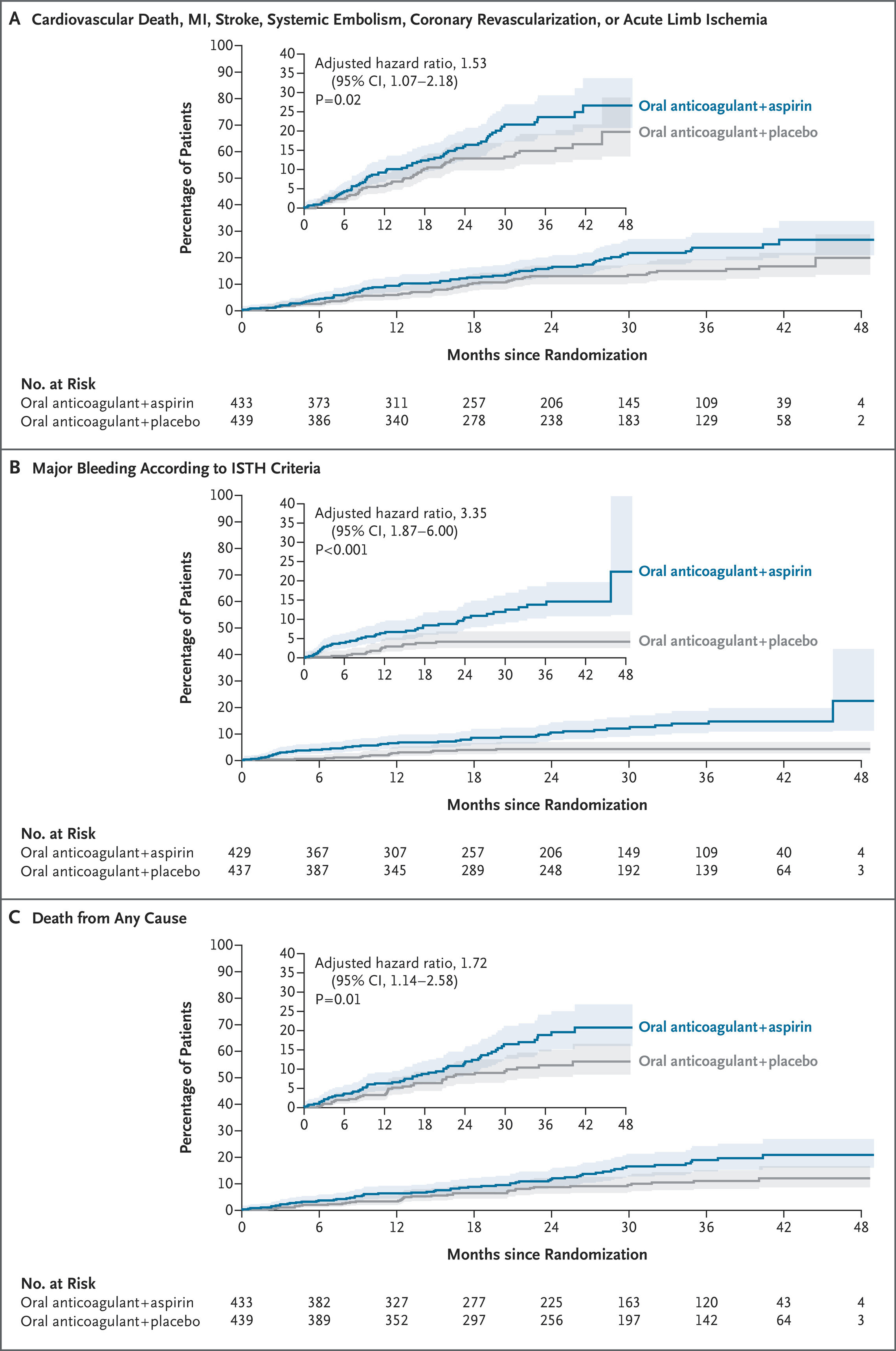 Parmi les patients atteints d'un syndrome coronarien chronique à haut risque athérothrombotique qui recevaient un anticoagulant oral, l'ajout d'aspirine a entraîné un risque plus élevé de décès cardiovasculaire, d'infarctus du myocarde, d'accident vasculaire cérébral, d'embolie systémique, de revascularisation coronaire ou d'ischémie aiguë des membres que le placebo, ainsi que des risques plus élevés de décès toutes causes confondues et d'hémorragie majeure. (Financé par le ministère français de la Santé et Bayer Healthcare ; numéro ClinicalTrials.gov, NCT04217447)