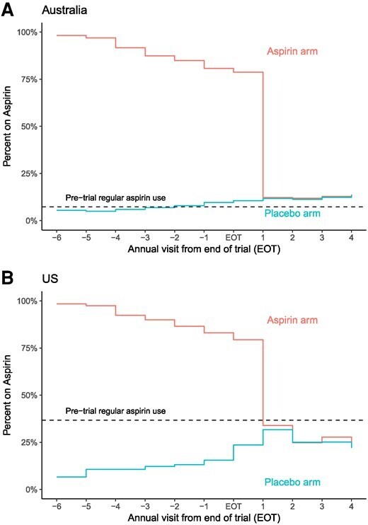 Exposition à l'aspirine avant, pendant et après l'essai, par pays et par groupe de randomisation dans l'étude ASPREE. Les visites annuelles sont présentées par rapport à la fin de l'essai, les données des participants étant censurées au moment de la survenue d'un événement cardiovasculaire indésirable majeur. L'exposition à l'aspirine a été définie comme une adhésion de 15 % ou plus au traitement par comprimés d'aspirine de l'étude (pour les participants randomisés dans le groupe aspirine seule), ou la déclaration d'une prise d'aspirine au moins deux jours par semaine dans les questionnaires, ou la présence d'aspirine dans la liste des médicaments concomitants.