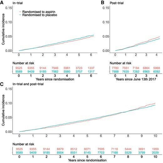 Cependant, pendant la période post-essai (médiane de 4,3 ans), le taux de MACE était plus élevé (RR 1,17, IC à 95 % : 1,01-1,36) chez les participants randomisés dans le groupe aspirine comparativement au groupe placebo. Sur l’ensemble de la période, le taux d’hémorragies majeures était plus élevé dans le groupe aspirine randomisé comparativement au groupe placebo (RR 1,24, IC à 95 % : 1,10-1,39).