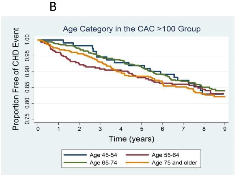- Pour les 75-84 ans, CAC 1-100 et >100 confèrent un risque multiplié par onze et vingt pour les événements CHD durs.