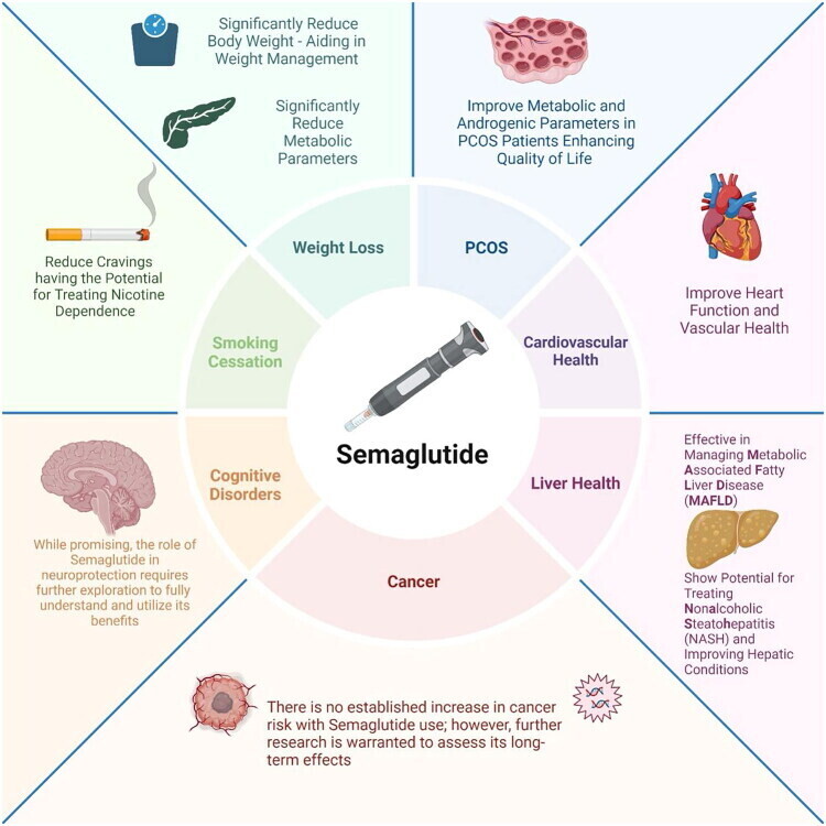Cet article de synthèse de Future Science OA explore les applications thérapeutiques étendues du semaglutide, un agoniste du récepteur GLP-1, au-delà de ses indications approuvées pour le diabète de type 2 et la réduction des risques cardiovasculaires. Les auteurs examinent les preuves de son efficacité pour la gestion du poids et l'amélioration des troubles métaboliques, notamment le syndrome des ovaires polykystiques (SOPK), les maladies rénales chroniques, et la stéatose hépatique associée au dysfonctionnement métabolique (MASLD). Le document met également en évidence le potentiel du médicament dans le soutien cardiovasculaire, ses effets neuroprotecteurs dans les troubles cognitifs comme la maladie d'Alzheimer (basés principalement sur des études précliniques). Il met par ailleurs en évidence son impact sur le risque de cancer et la cessation du tabagisme. En conclusion, les chercheurs insistent sur la nécessité de poursuivre les études chez l'homme pour confirmer ces bénéfices divers et surveiller les effets indésirables potentiels.