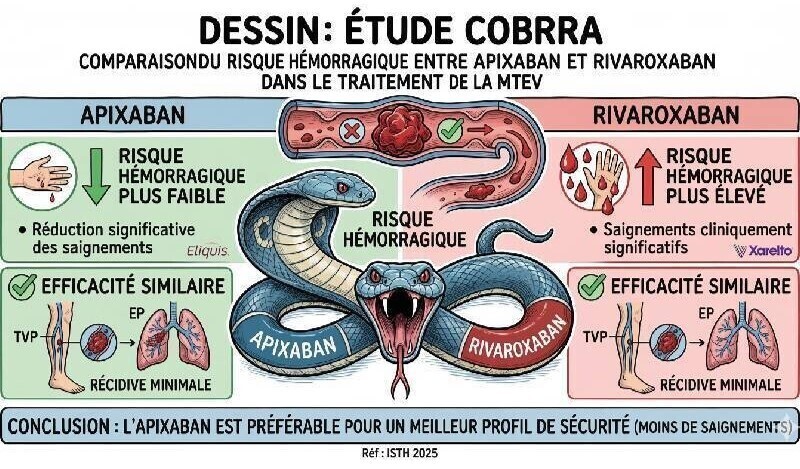 Cette étude clinique internationale, nommée COBRRA et publiée dans le New England Journal of Medicine, compare la sécurité de deux anticoagulants oraux, l'apixaban et le rivaroxaban, chez des patients souffrant de thromboembolie veineuse aiguë. Les chercheurs ont mené un essai randomisé sur trois mois pour déterminer laquelle de ces molécules présentait le risque de saignement le plus faible tout en prévenant efficacement les récidives de caillots sanguins. Les résultats démontrent de manière significative que l'apixaban entraîne moins de saignements cliniquement pertinents que le rivaroxaban, sans pour autant sacrifier l'efficacité du traitement. En conclusion, ce texte fournit une preuve scientifique importante pour aider les médecins à choisir la thérapie la plus sûre afin de gérer les risques hémorragiques lors du traitement initial des thromboses et embolies pulmonaires.