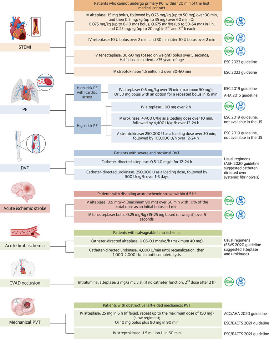 Streptokinase is no longer available in the United States. b Not for mild nondisabling stroke. c Class of recommendation is IIb. d For patients presenting with moderate acute ischemic stroke likely to produce mild disability and known left atrial or ventricular thrombus, treatment with IV alteplase is of uncertain net benefit. ASA = American Stroke Association; CABG = coronary artery bypass grafting; MI = myocardial infarction; ESO = European Stroke Organization. Other abbreviations as in Figure 1. References: STEMI: ACC/AHA 2025 202 ; ESC 2023. 6 Acute ischemic stroke: AHA/ASA 2019 20 ; ESO 2020. Rashedi