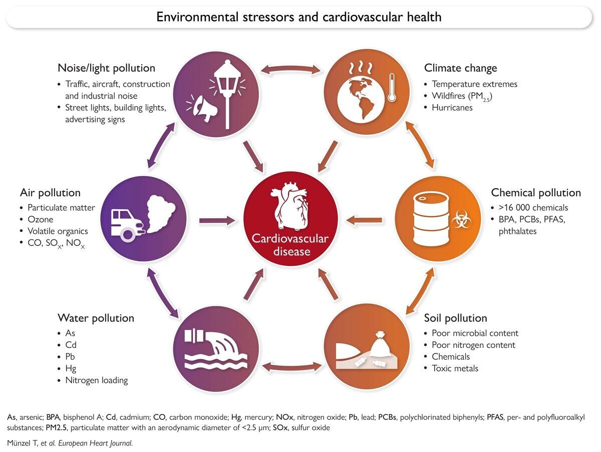 Les facteurs de stress environnementaux et la santé cardiovasculaire Les multiples expositions environnementales, y compris la pollution sonore et lumineuse, la pollution de l'air, la contamination de l'eau et des sols, la pollution chimique et le changement climatique, contribuent aux maladies cardiovasculaires (MCV) grâce à des voies partagées et d'interaction impliquant le stress oxydatif, l'inflammation, le déséquilibre autonome et le dysfonctionnement endothélial. L'interaction entre ces facteurs de stress amplifie le risque cardiovasculaire global et souligne la nécessité de stratégies intégrées de prévention basées sur les exposomes.