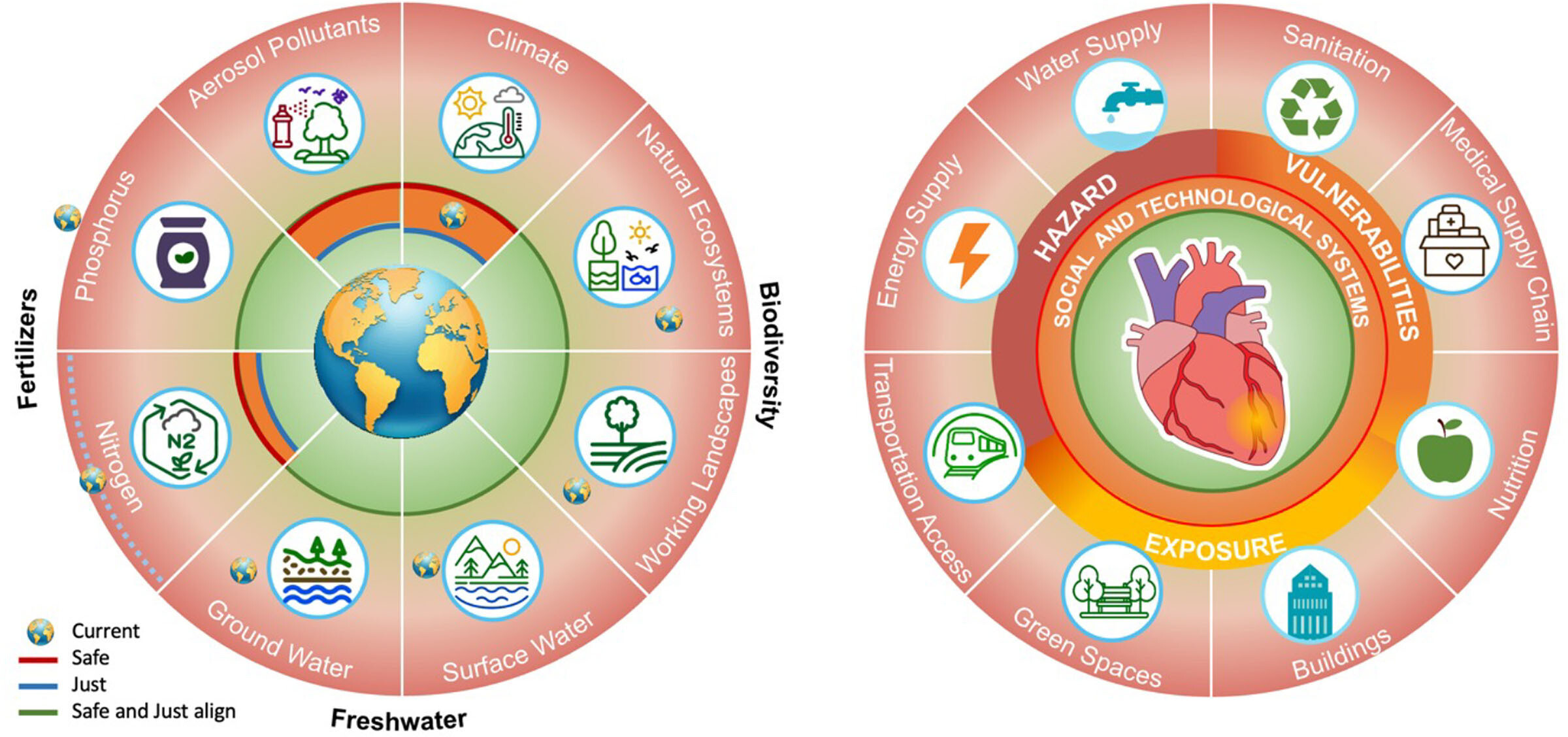 Santé planétaire et cardiovasculaire, les 2 parties indivisibles du même jeton à la santé. A, Le nouveau cadre de limites planétaires des limites du système terrestre, où les limites sûres et justes et les états globaux actuels (icônes de la Terre) sont représentés. L'accès minimum à l'eau, à la nourriture, à l'énergie et aux infrastructures pour tous les humains pourrait constituer la base d'un « couloir » sûr et juste. B, À l'échelle mondiale, les principaux systèmes d'approvisionnement qui fournissent de la nourriture, de l'énergie, la connectivité à la mobilité, du logement, des infrastructures vertes, la gestion de l'eau et la gestion des déchets et l'accès aux soins de santé sont au cœur du bien-être humain, de l'équité et de la durabilité. Adapté de la nature. 2023 Jul;619(7968):102-111, un article en libre accès distribué selon les termes de la licence Creative Commons CC BY.