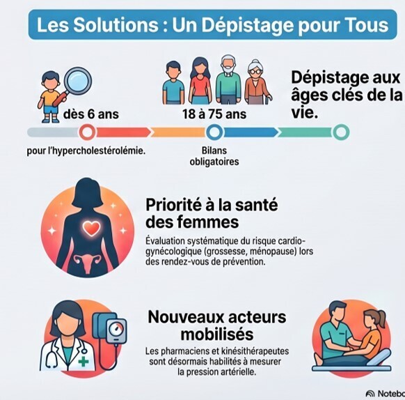 Face à cette réalité encore trop méconnue par les patients eux-mêmes, la proposition de loi telle qu’amendée en commission veut rendre obligatoire le dépistage cardio-vasculaire (hypertension, diabète, cholestérol), notamment via les bilans prévention aux âges clésde la vie (18-25 ans ; 45-50 ans ; 60-65 ans ; 70-75 ans), ainsi que lors de la visite de dépistage professionnelle de mi-carrière des salariés,autour de 45-50 ans "
